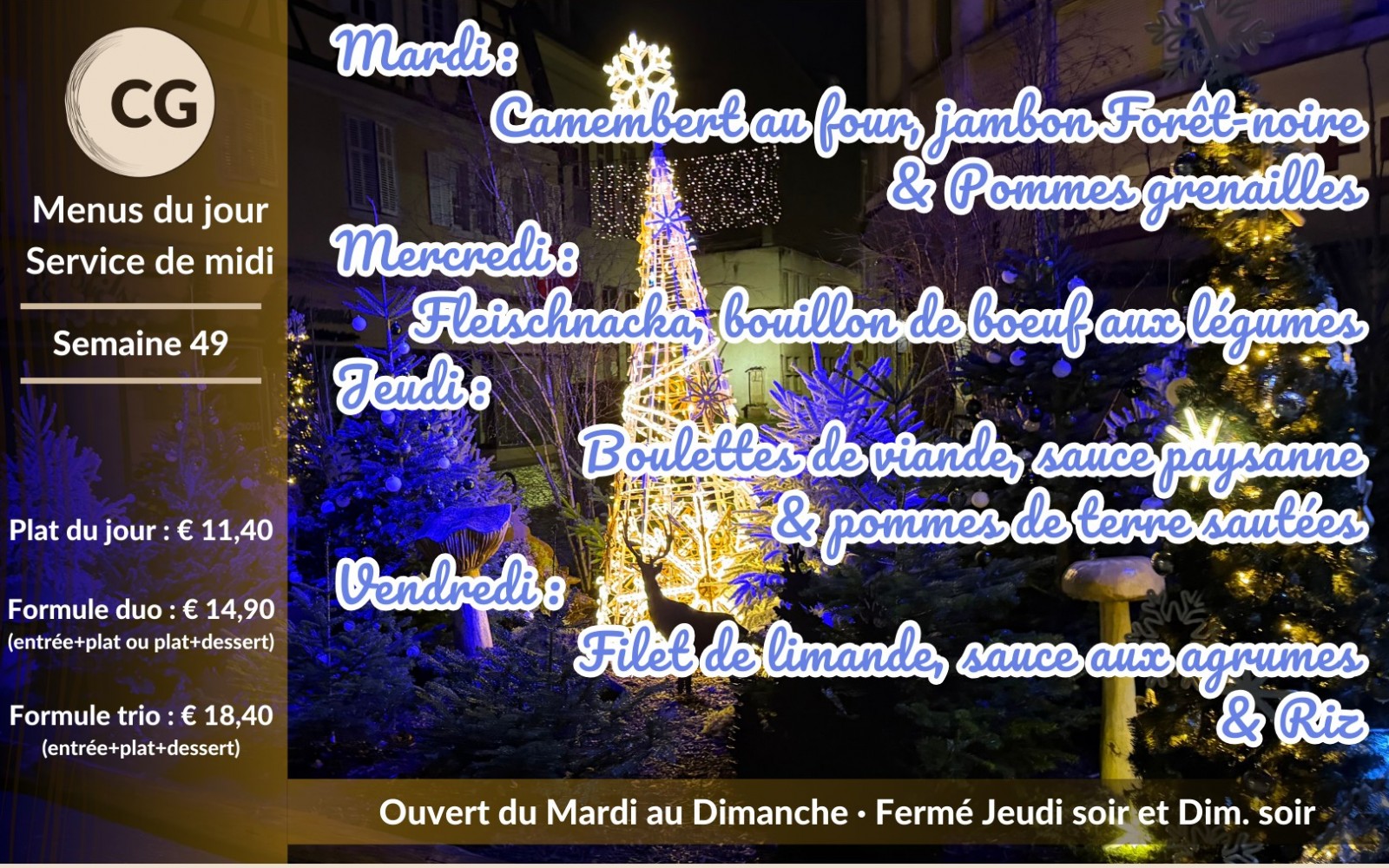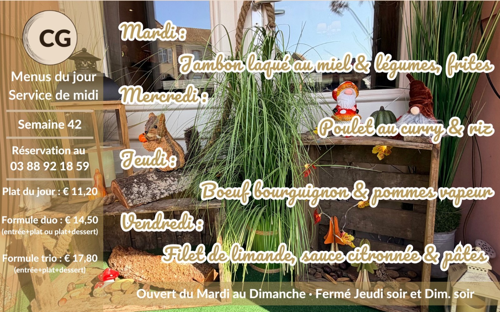 Spaetzles frais maison, lardons, oignons, crème fraîche, gratinés au munster fermier, salade. Vinaigrette maison.