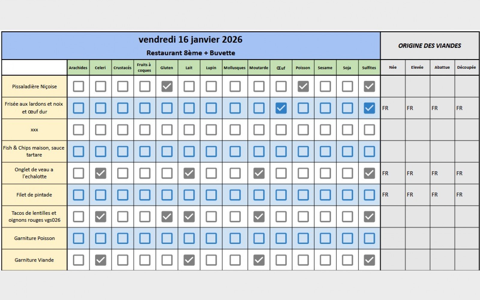 Pour connaitre les allergènes présents dans nos plats, vous pouvez vous référer à l'onglet "Allergènes".