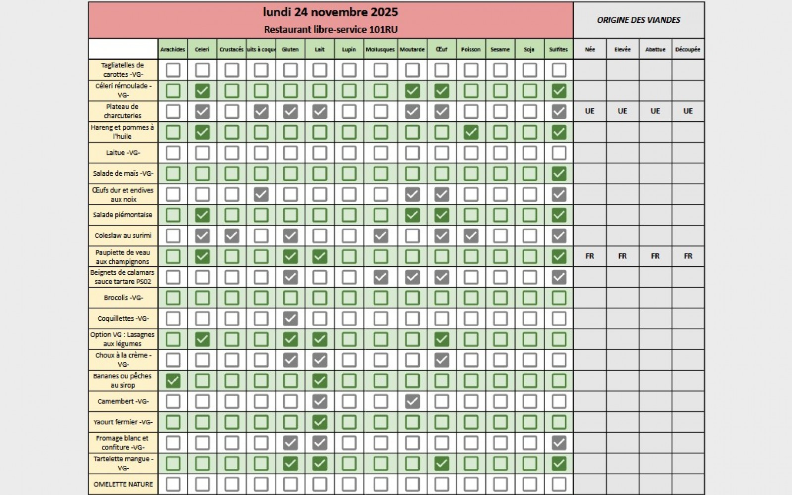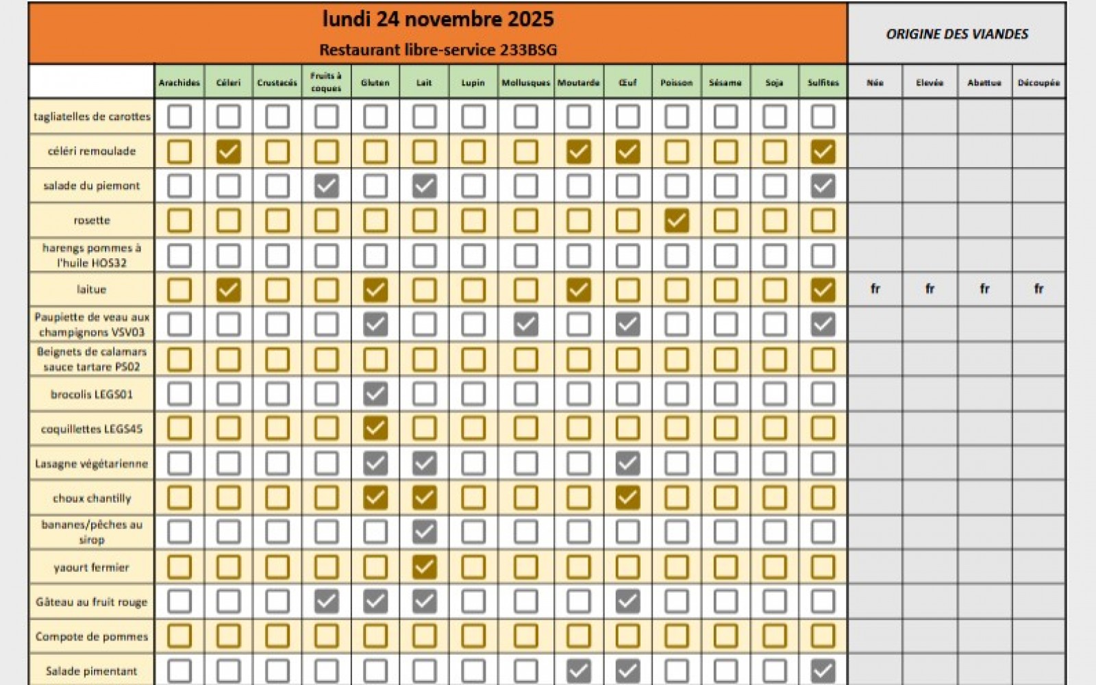 Menu SP Informations générales Allergènes Allergènes self 101 RU Allergènes self 233 BSG