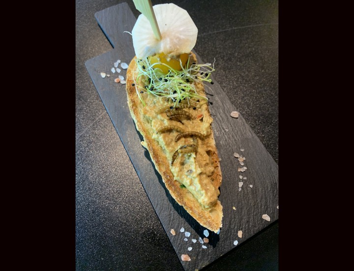 „Chipotle de la muerte“, zubereitet mit Tequila, Zitrone und Carolina Reaper (einer der schärfsten Paprikaschoten der Welt) und dekoriert mit Mehlwürmern und einer Grille