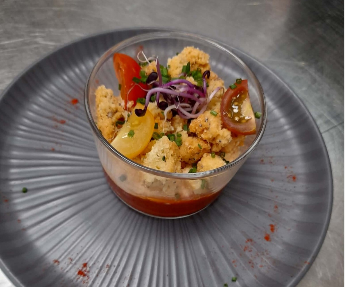 Coulis de tomates, mousse mascarpone au chorizo, sablé aux grainesGERICHTE Es ist auch möglich, ein Gericht aus dem AKTUELLEN MENÜ auszuwählen