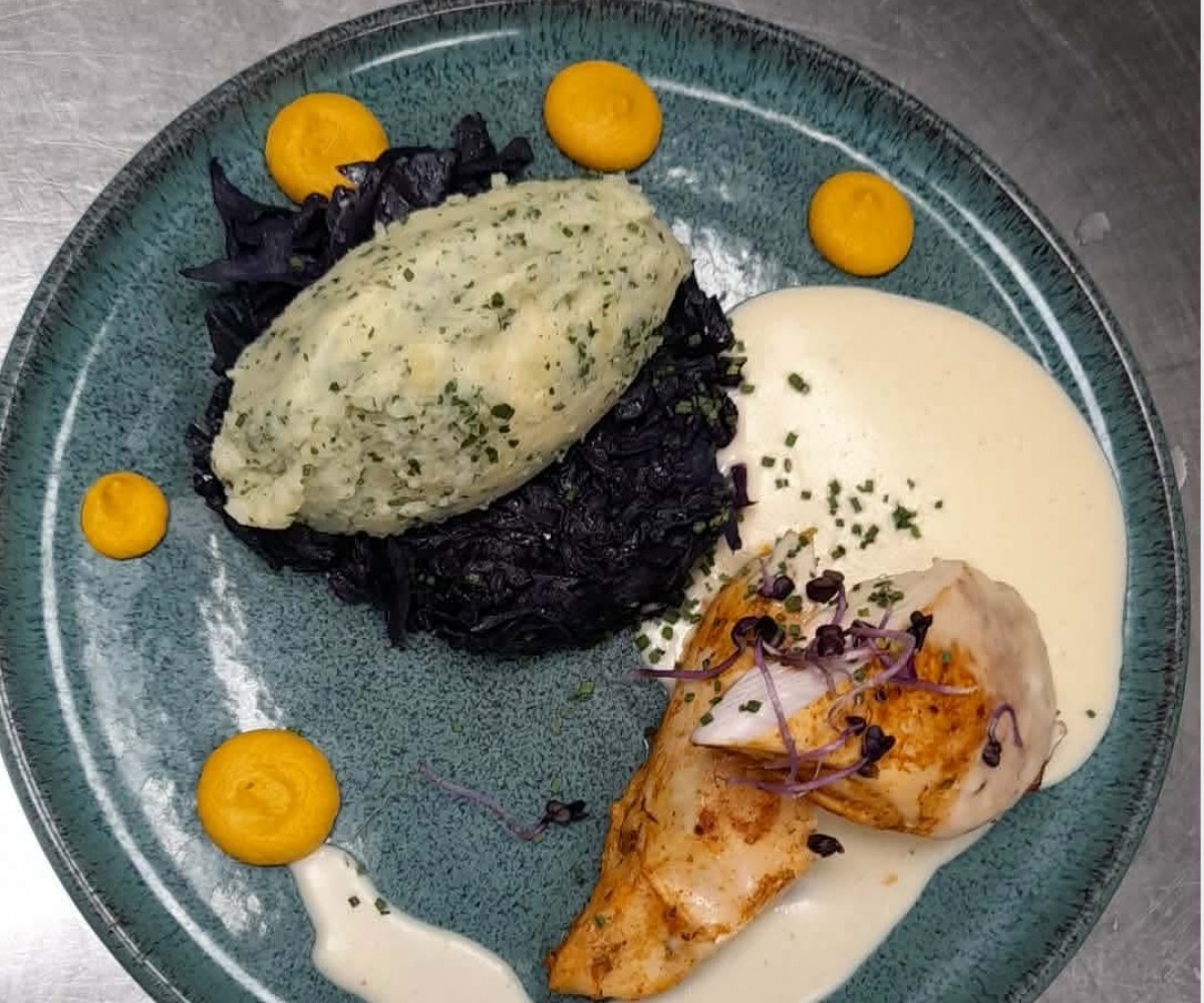 Filet de poulet basse température sauce Gaston Gérard, écrasé de pommes de terre aux herbes, étuvée de chou rougeORIGINE FRANCE
