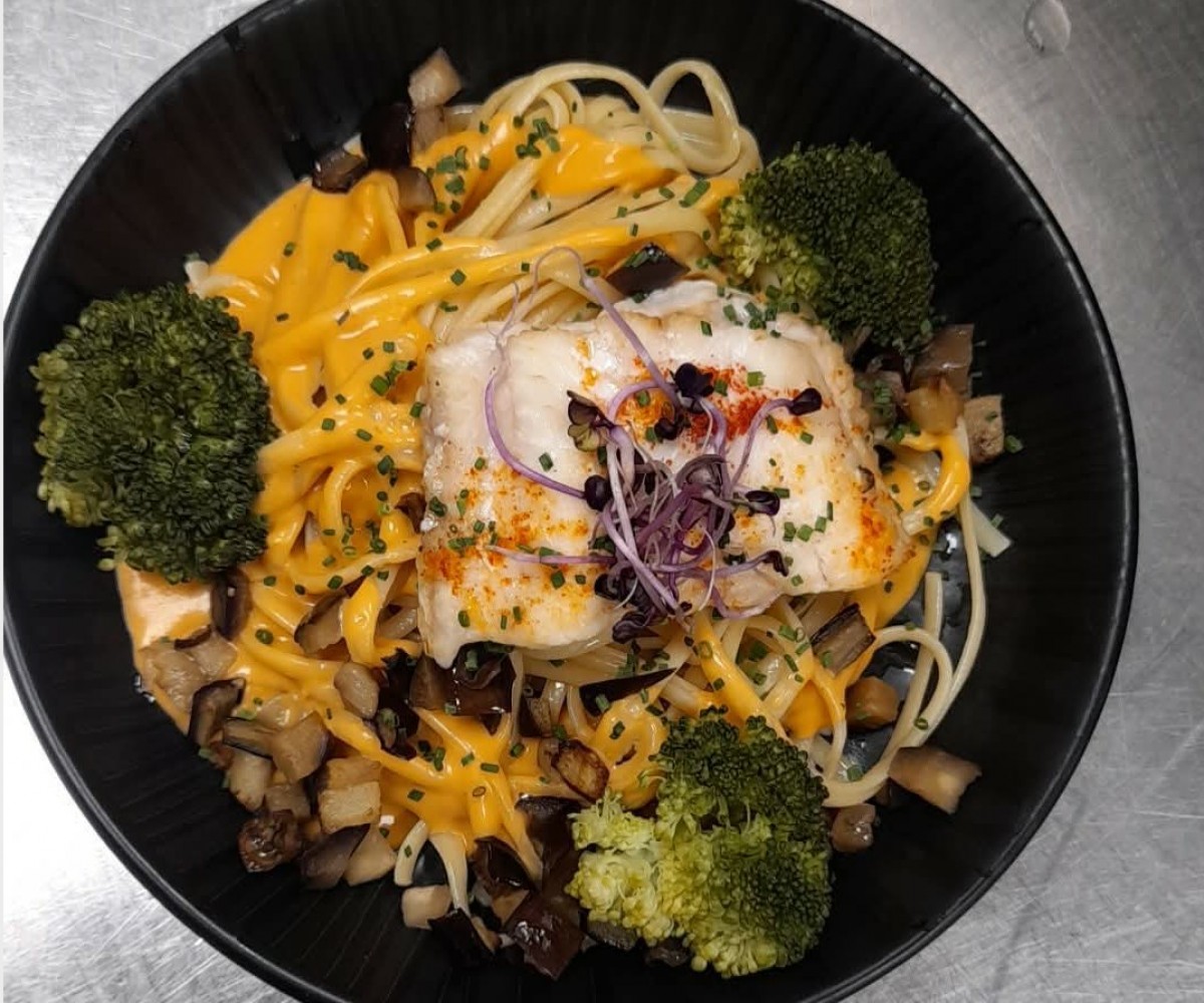 Filet de loup de mer, fettuccine, aubergine et brocolis, sauce bisque crémée