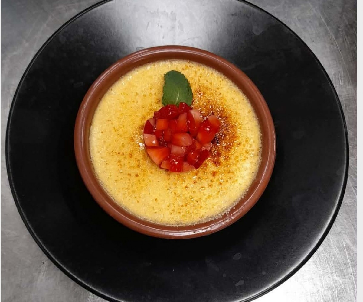 Vanille-Crème-Brûlée mit frischen Erdbeeren