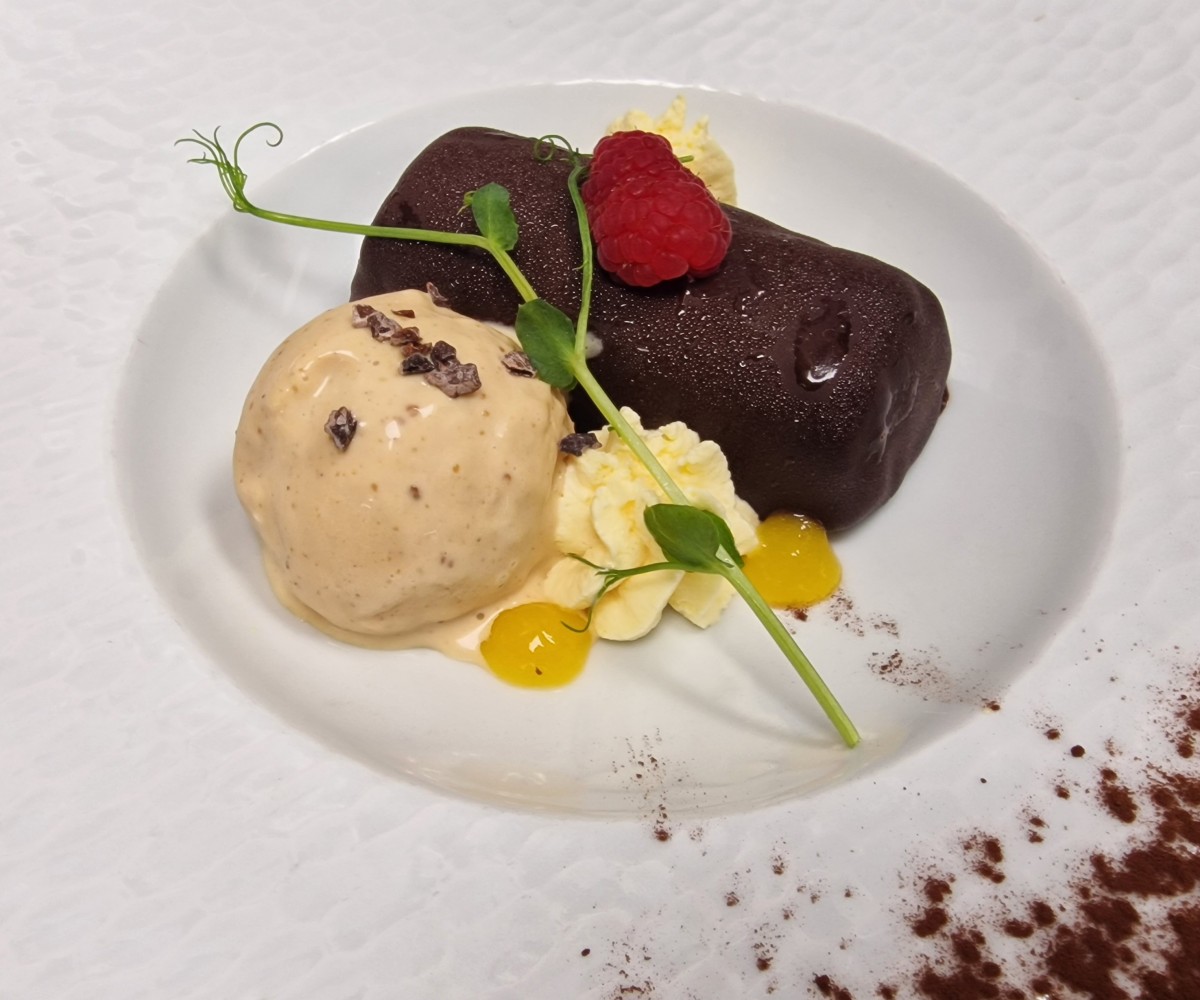 Alexis' chocolate-passion fruit macaron with homemade mango sorbetNet prices - Taxes and service included