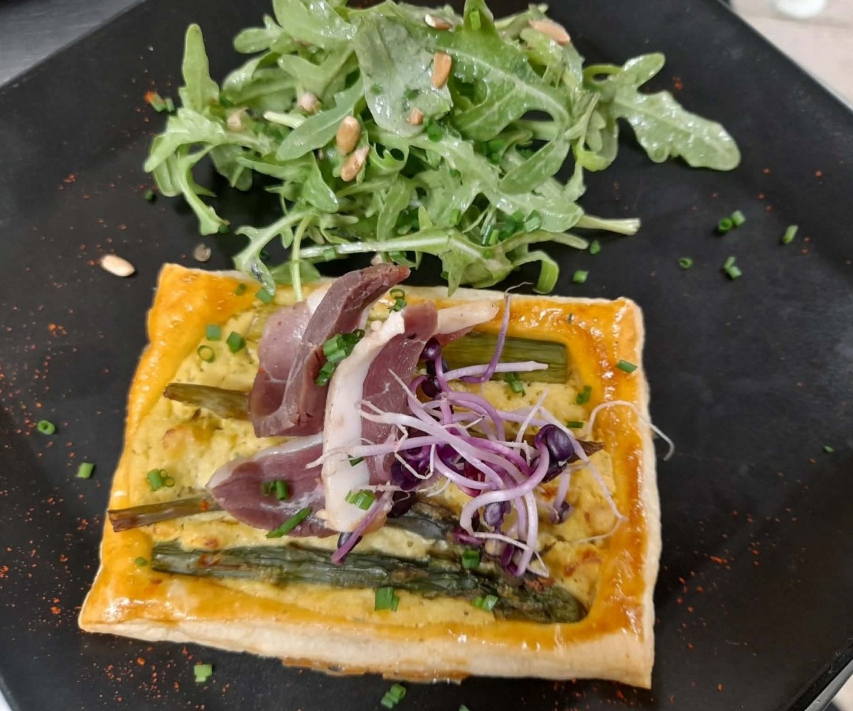 Tarte fine aux asperges vertes et magret de canard fumé par nos soinsORIGINE FRANCE
