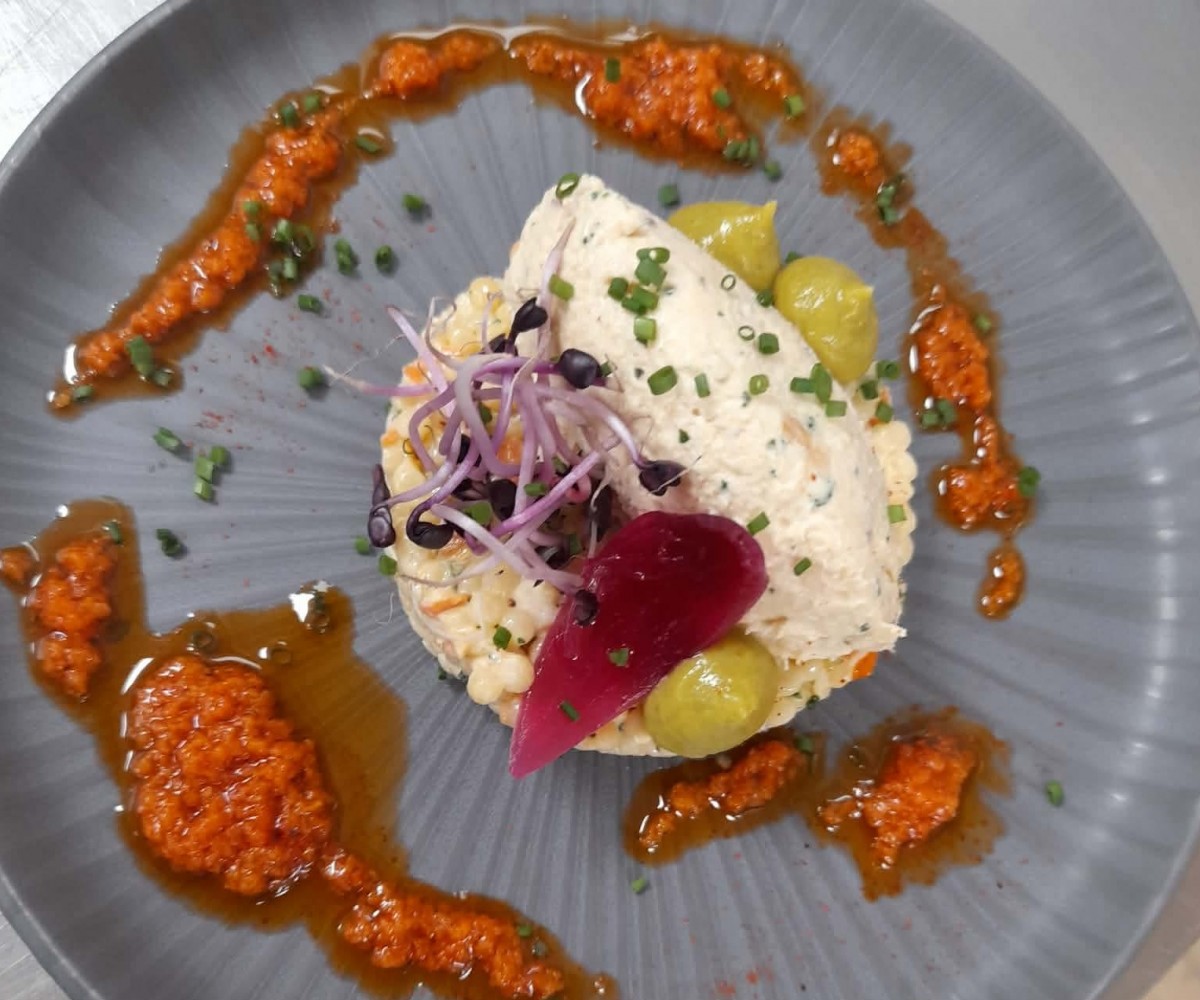 Ensalada de trigo perlado con verduras baby, rillettes de pollo y pesto rojo.