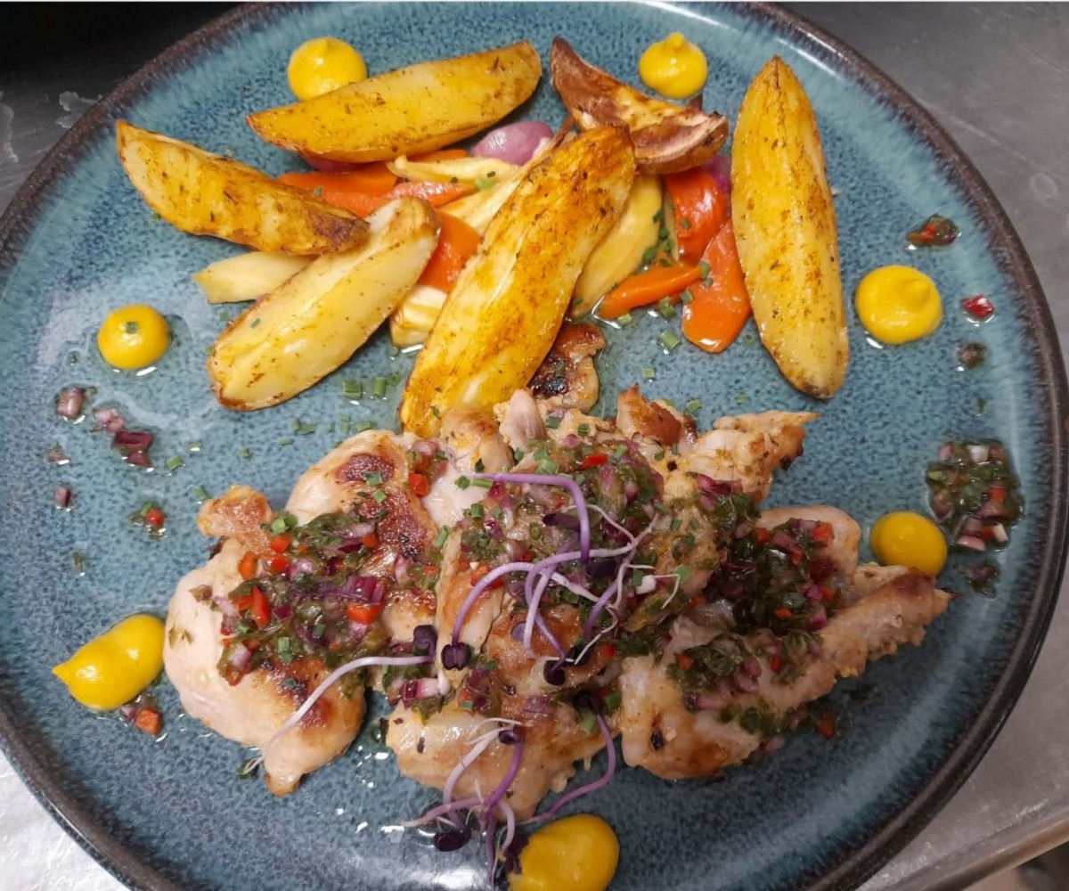 Cerdo marinado a la parrilla, salsa chimichurri, patatas gajo y verduras de raíz.ORIGEN FRANCIA