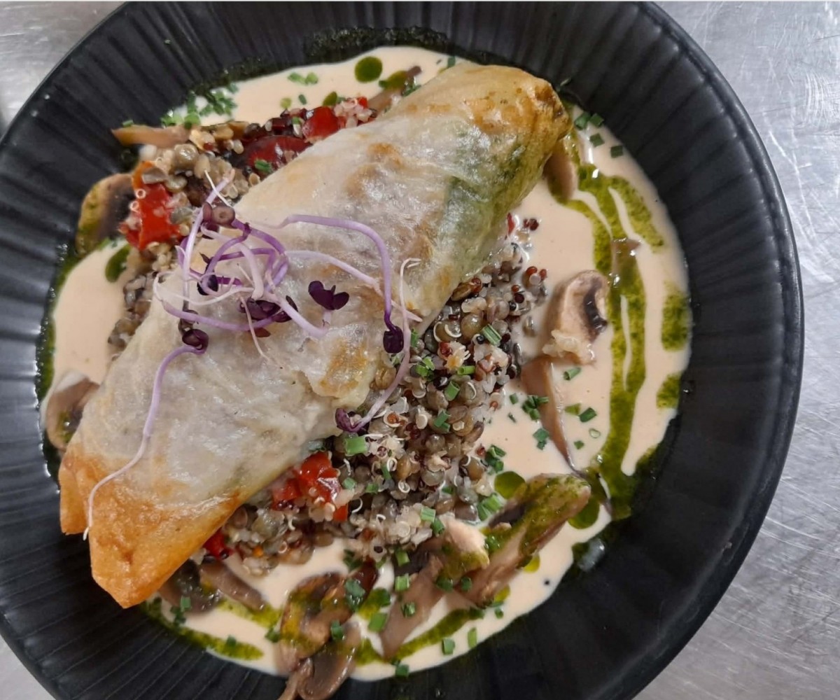 Rollito de primavera con bacalao negro, lentejas y quinoa con pimienta, salsa Crémant de Bourgogne y champiñones salteados.