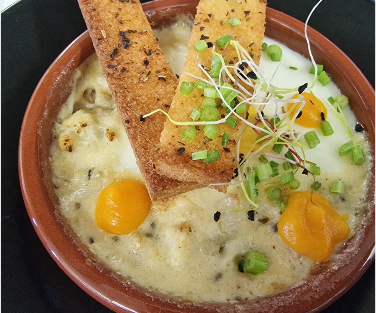 焼き卵、ローストカリフラワー、ベーコンクリーム、ハーブトーストソルジャー