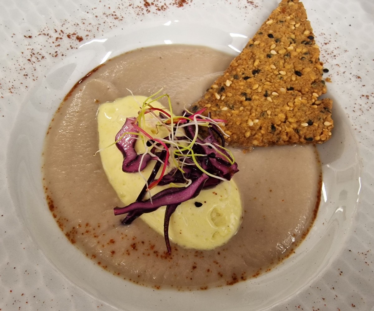 Velouté de châtaigne et céleri rave, chantilly savora, biscuit au sésame