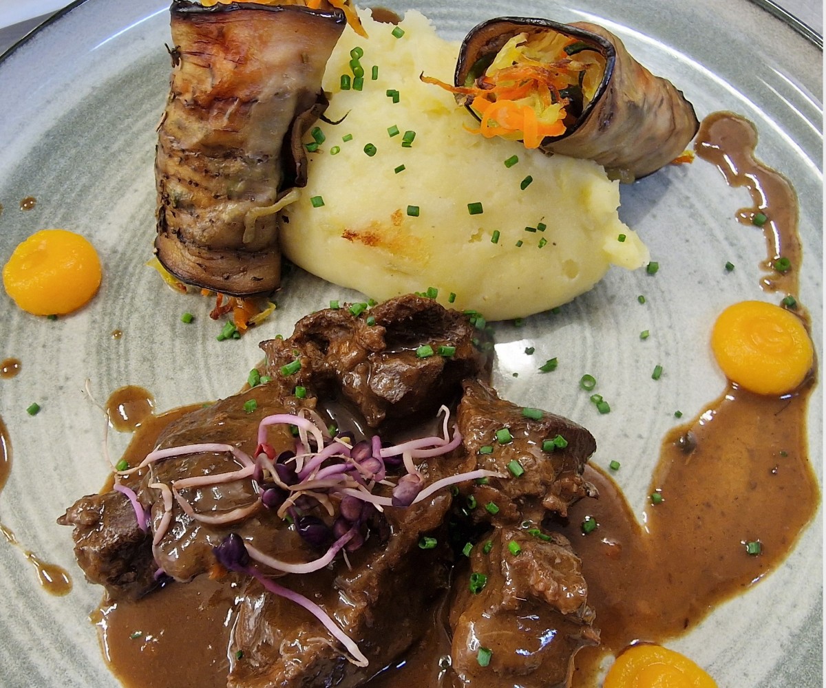 Noix de joue de boeuf confite, écrasé de pommes de terre et roulade de légumesディッシュデザートメニュー