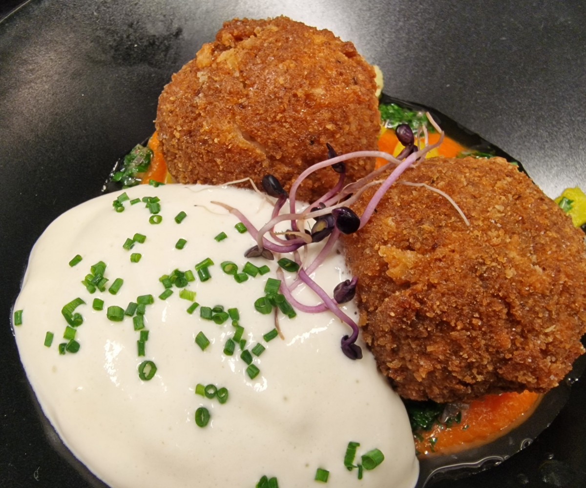 Arancinis maison, espuma au gorgonzola, gremolata et légumes racines confits
