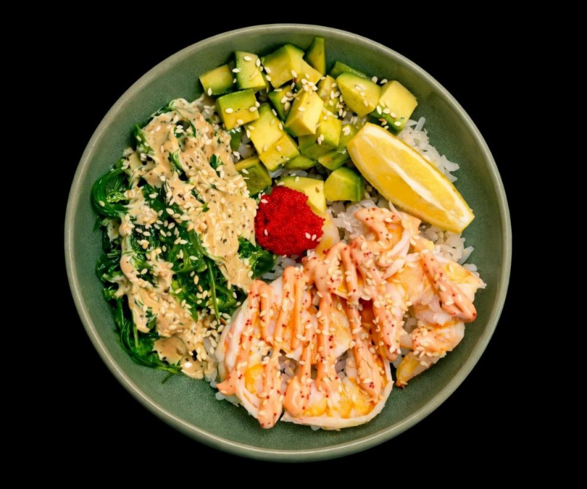 Nori, Reis, Frischkäse, Tobiko-Kaviar, Garnelen, Eisbergsalat, Gurke, AvocadoGarniert mit würziger Sauce
