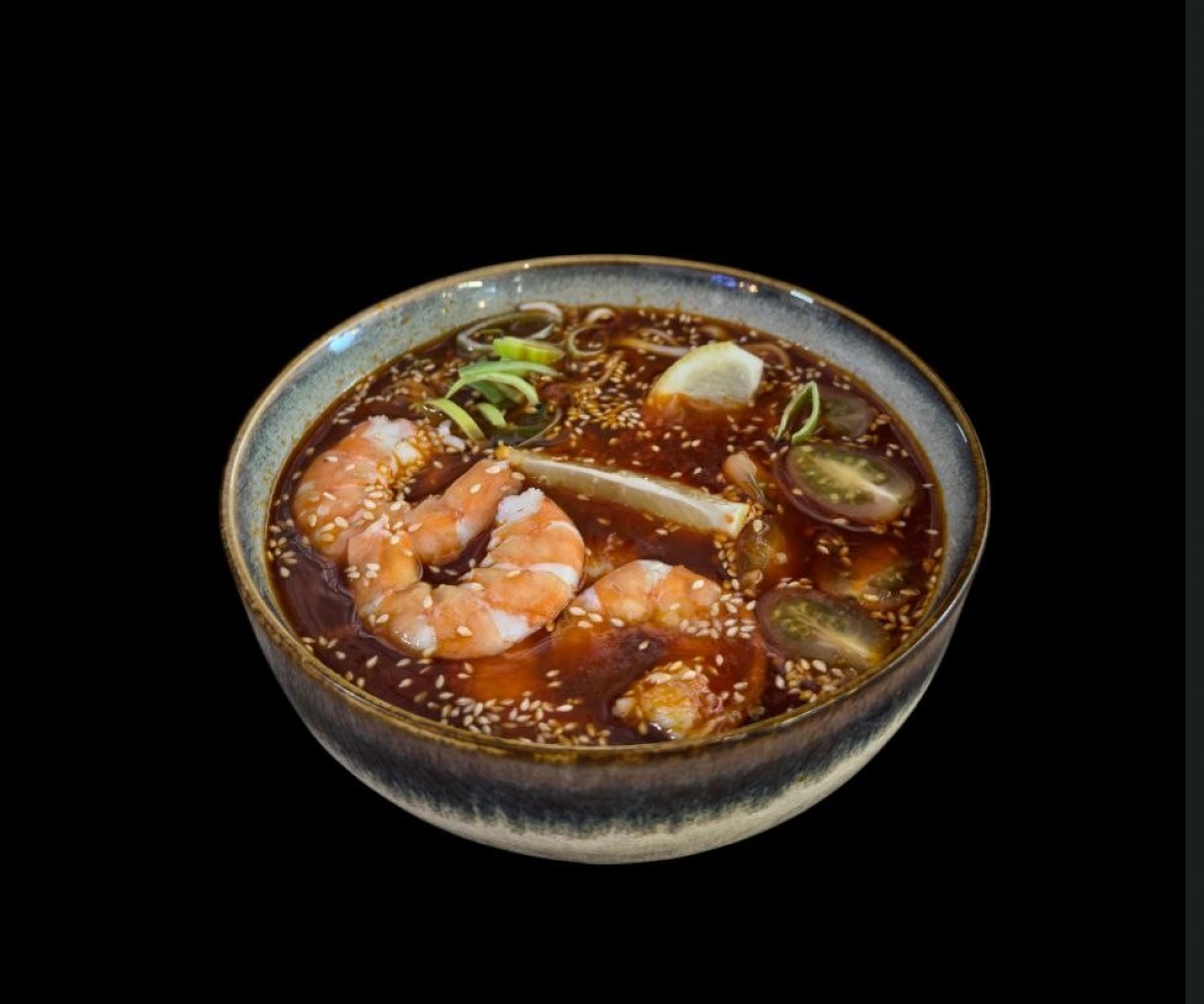 صلصة توم يام حارة، موزاريلا، جمبري، بلح البحر، طماطم، فلفل حار.