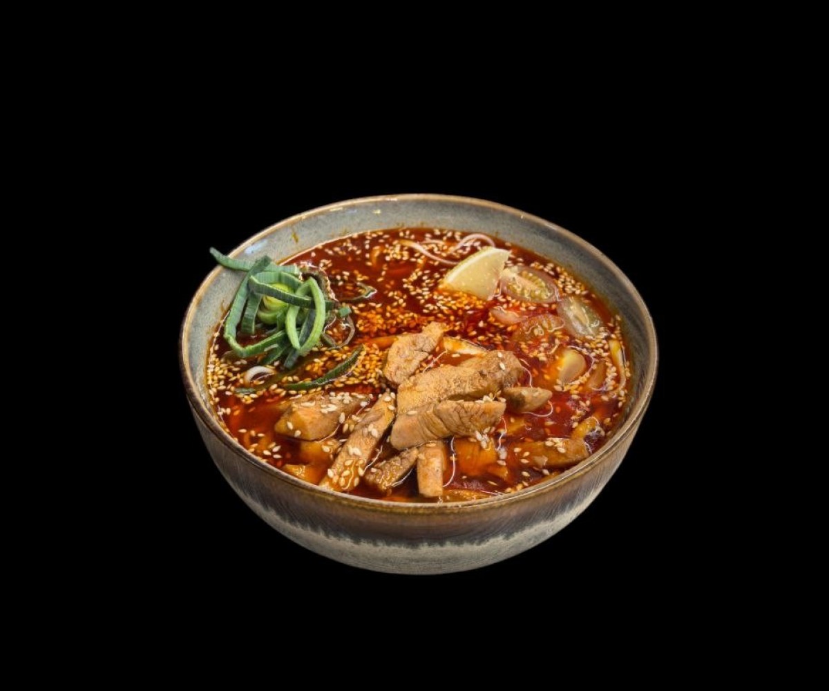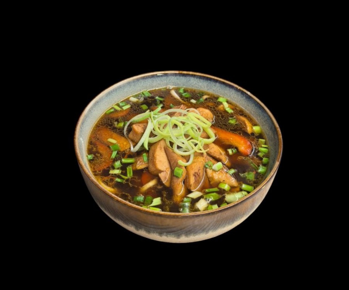 الثوم، الفلفل الحار، لحم الخنزير المقدد، صلصة الصويا، الفلفل الحلو، الكوسة، الشعرية، صلصة الباربكيو، السمسم، البصل الأخضر، الكراث