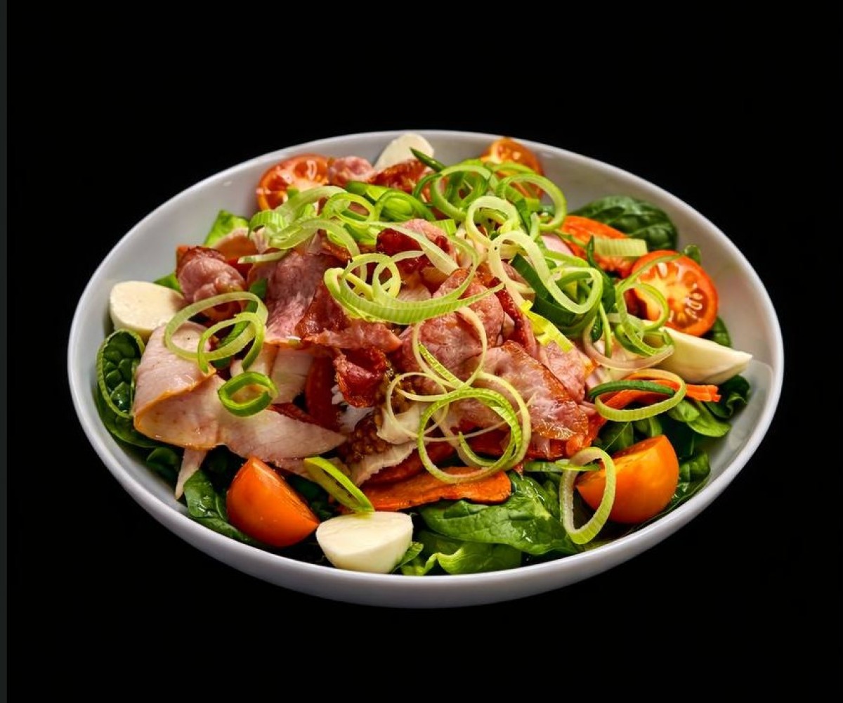 Iceberg lettuce, greens, pepperoni, chicken breast, cherry tomatoes, Italian dressing, mini mozzarella, deep-fried bacon, leeksYIELD: 260 g