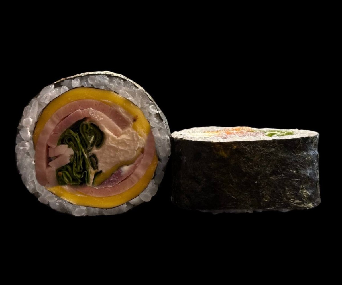 Нори, рис, сыр творожный, бекон, Чеддер, айсберг.Порция: 8шт.