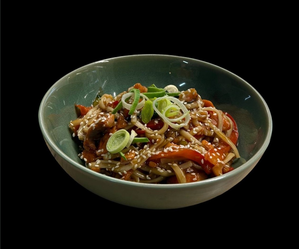 Чили, чеснок, перец болгарский, соевый соус, терияки соус,филе куриное, лапша, лук порей, лук зеленыйДраники