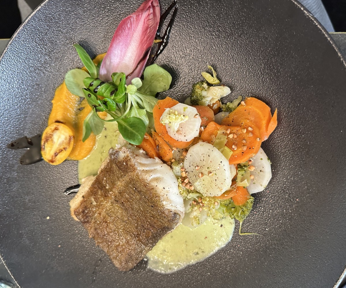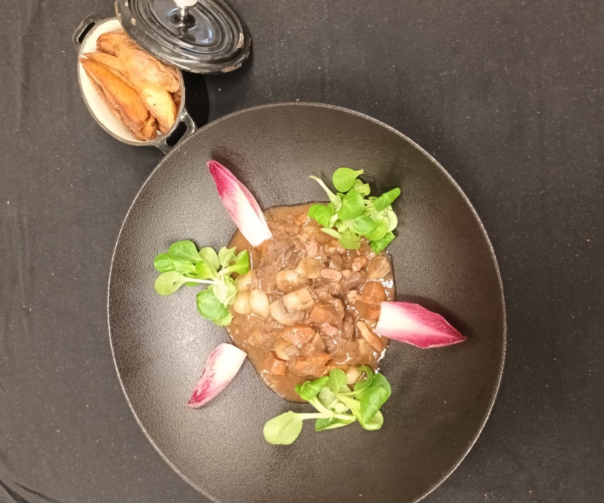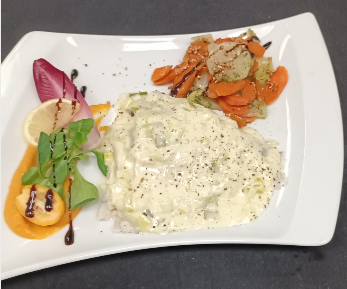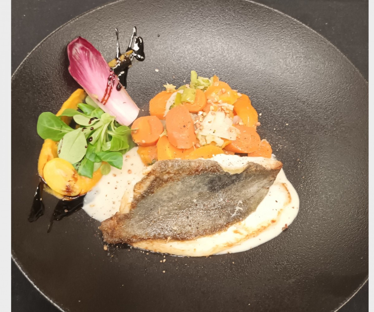 Plat du jour : Suprême de poulet, sauce chorizo, ecrasée de pomme vitelotte