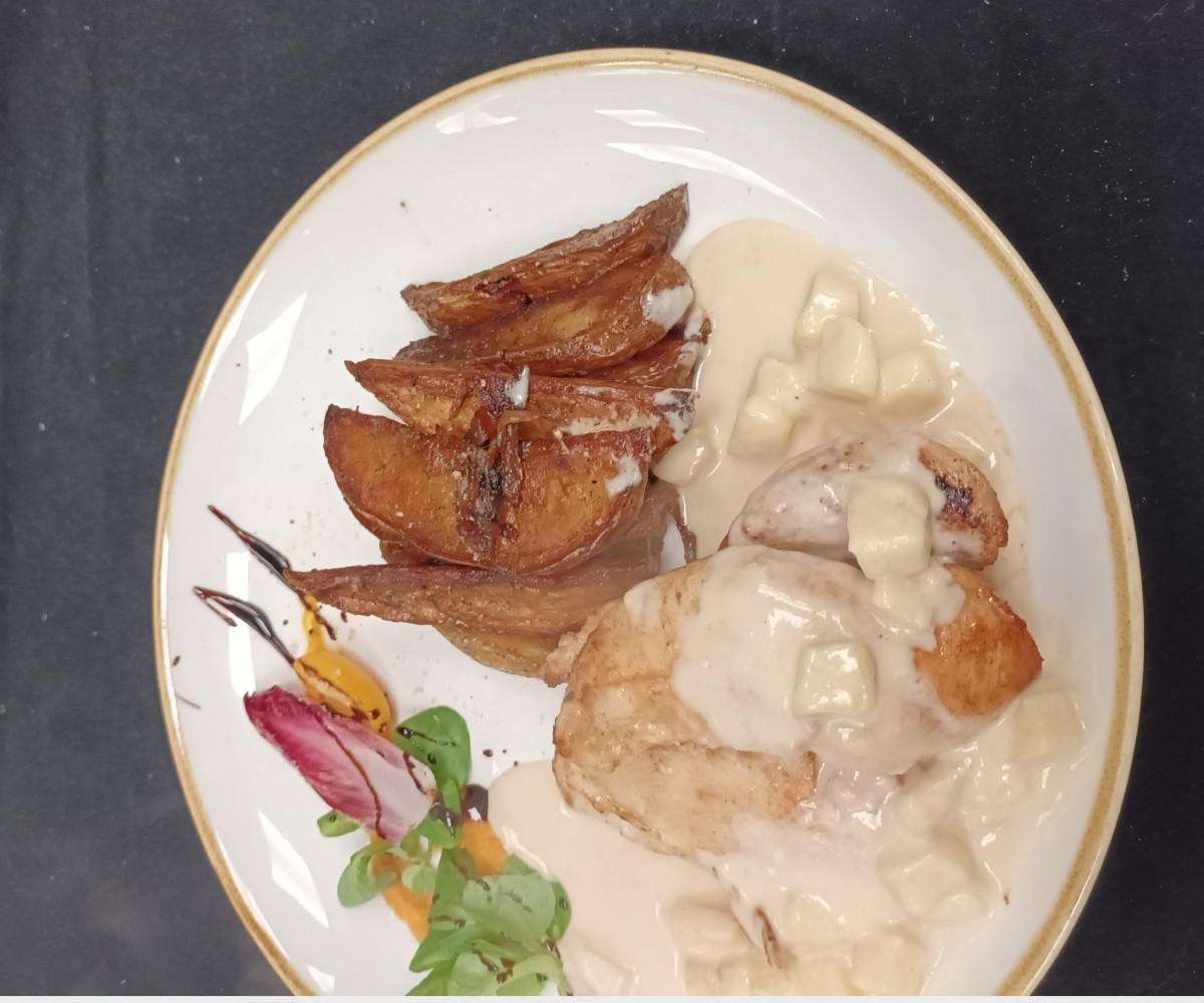 Aiguillettes de chapon rôti crème de cidre et pommes